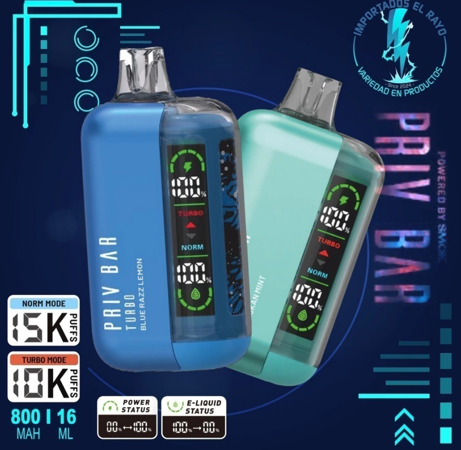 Priv Bar Turbo 15000 Vape desechable es un dispositivo extraordinario equipado con 16ml de e-liquid precargado y una batería recargable. Está equipado con una pantalla que permite la visualización del estado de la batería como el nivel de e-juice. Diseñado para ofrecer aproximadamente 15,000 inhalaciones, Priv Bar Turbo promete una experiencia de vapeo extensa. Aprovecha la tecnología avanzada de SMOK, lo que garantiza una producción de vapor denso y una entrega satisfactoria de nicotina. La comodidad adicional de la pantalla permite a los usuarios monitorear sin esfuerzo tanto los niveles de batería como de e-liquid, mejorando la experiencia general de vapeo.
